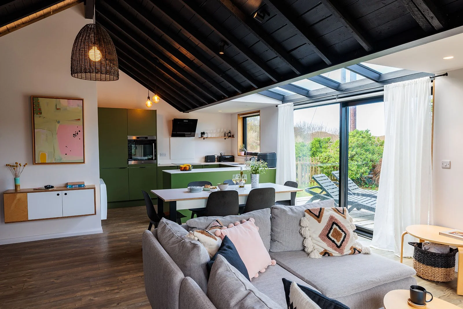 The front door leads directly into the spacious open plan kitchen/living room which is flooded with light from large sliding doors and roof lights with views across the dunes. The kitchen includes a large 70:30 fridge freezer, dishwasher, electric oven, induction hob, microwave, kettle, coffee machine, air fryer and toaster.